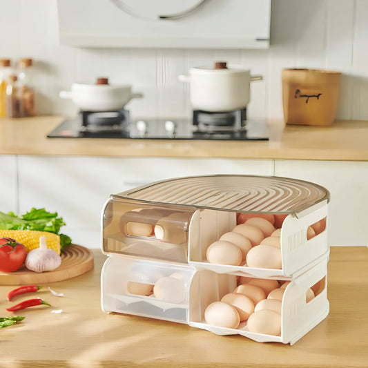 U-shaped egg storage box with stackable design holds 30 eggs across multiple layers, featuring PP construction and semi-transparent colour options for organised kitchen storage