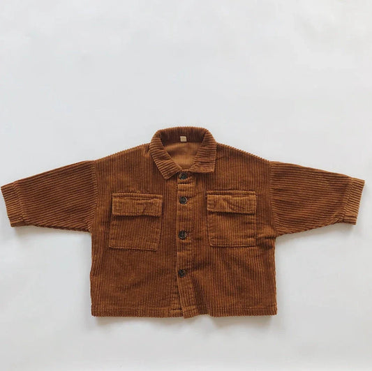 Vintage Kids Corduroy Loose Cardigan Jacket: Korean-style single-breasted jacket with corduroy fabric in brown coffee, dark green, and Mi Xing colours for children aged 80-130cm