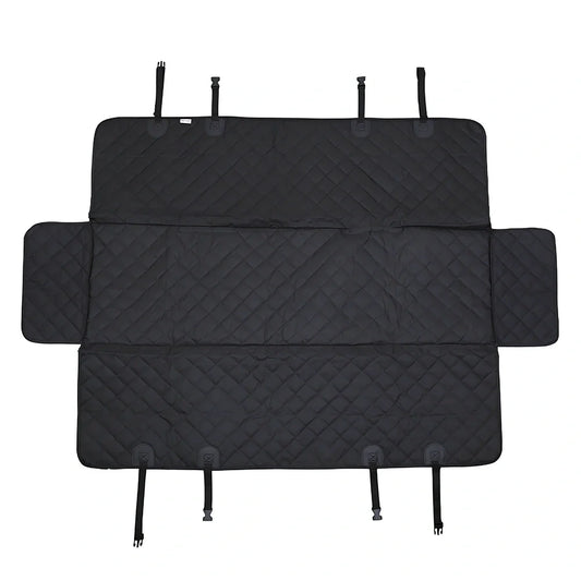 Waterproof dog car boot mat with 600D Oxford cloth construction, featuring integrated storage bag and anti-skid net for secure pet transport in three size options