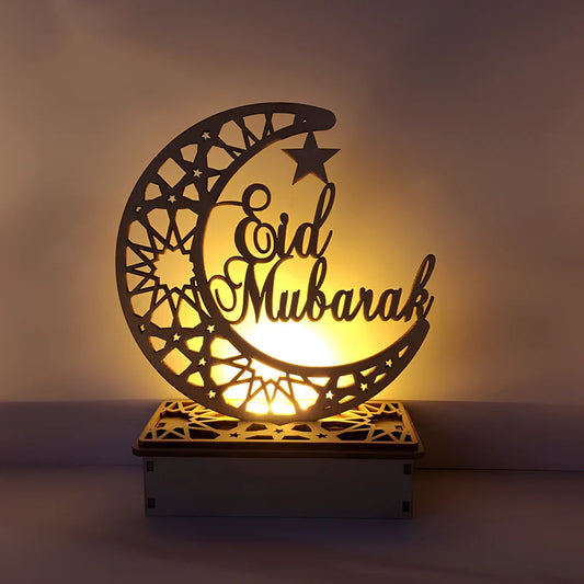 Wooden DIY Islamic palace LED decoration with Eid Mubarak embroidery: Handcrafted basswood laser-cut design for home celebration displays, featuring four colour options and battery-operated LED lighting