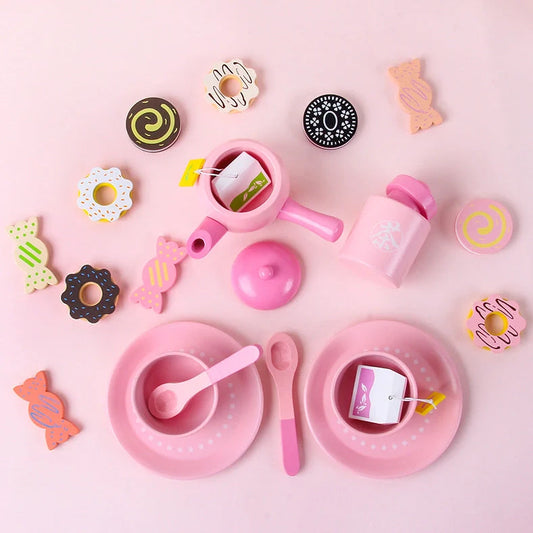 Wooden children's simulation afternoon teapot cup set for toddlers aged 0-3, designed with Barbara pink colour scheme to cultivate emotional development and interest in imaginative play through realistic tea party scenarios