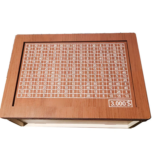 Wooden money box piggy bank with built-in coin counter and removable storage compartment measuring 20×14.5×7.6cm for teaching children money management skills through visual savings tracking