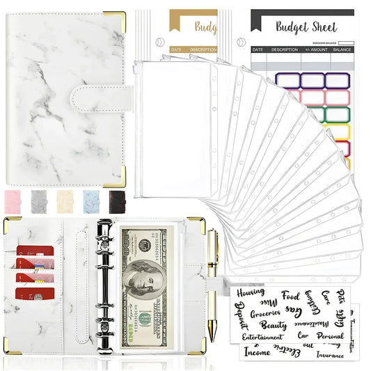 A6 loose-leaf binder journal with 6-hole spiral binding and 12 colour budget sheets for organised cash tracking and customisable note-taking