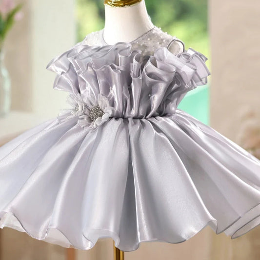 A sleeveless princess dress for girls' birthday banquets, made from 100% polyester fabric in a slim fit design with round neckline and short length, available in eight sizes from 90cm to 160cm and a smoky grey colour.