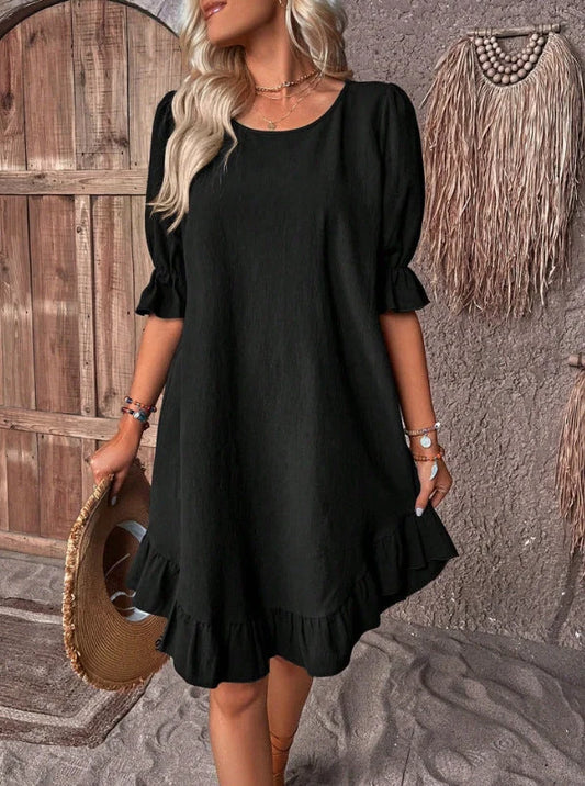 Hhomeenjoy Cotton Linen Ruffle Short-sleeved Dress with Round Neck