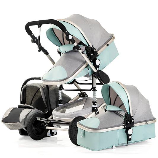 Aluminium frame travel baby stroller with 4 EVA wheels and five-point safety harness, suitable from birth to 3 years with front and rear facing options and removable washable cushions