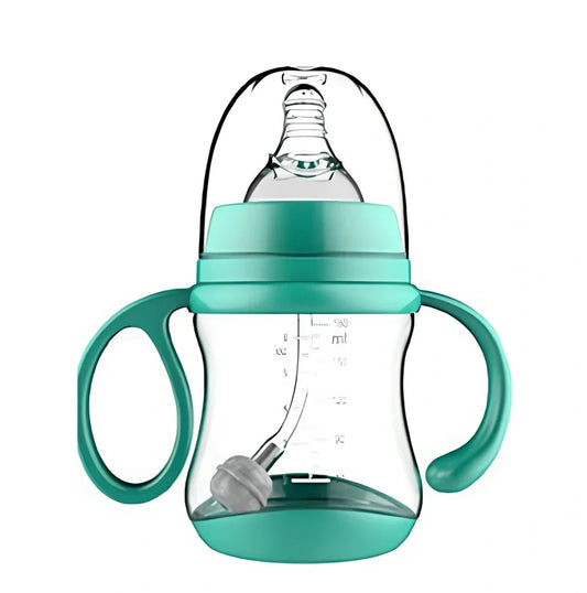 Baby feeding silicone bottle with food-grade PP construction withstands 110°C temperatures and curved double handles for secure infant grip in 180ml, 240ml, or 300ml capacities