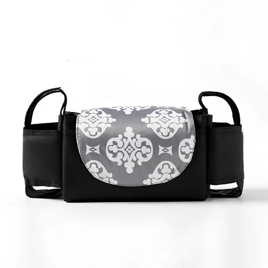 Baby stroller organiser with 35x11x15cm capacity cup holder bag attaches to 90% of prams using pole mounting system for one-handed access to baby essentials while out and about