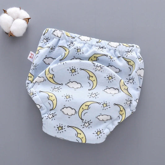 Baby training pants with 6-layer gauze construction for reusable nappy training, featuring pure cotton material and three size options from 90 to 110cm for infants 0-18kg