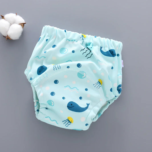 Baby training pants with washable 6-layer gauze construction for absorbency and breathability, designed for infants and toddlers aged 0-6 years in sizes S, M, L with five colour sets available