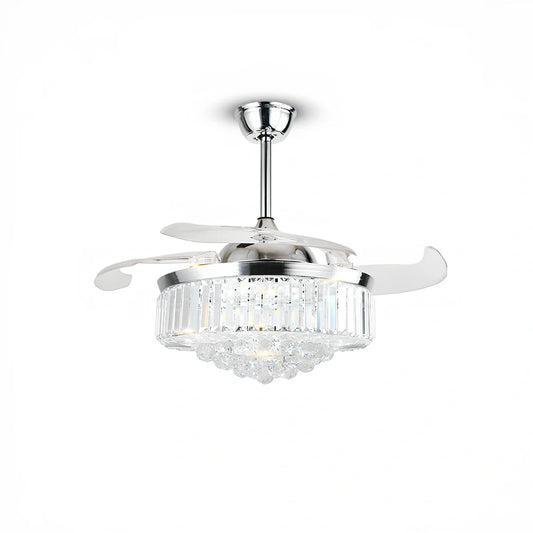 Crystal fan light with invisible LED chandelier featuring variable frequency stepless dimming control and all-copper construction for energy-efficient cooling and ambient lighting in 36, 42, and 48-inch sizes