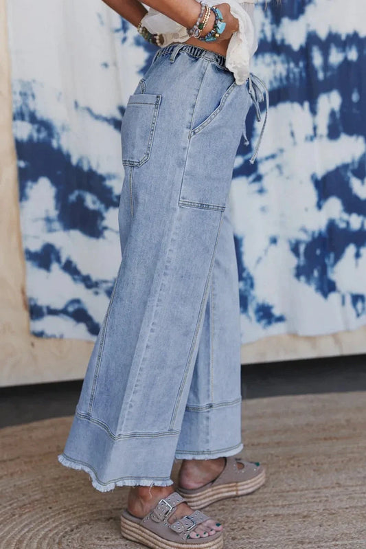 Beau Blue drawstring seam detail raw hem wide leg denim trousers with 75% cotton composition for breathability and 2% elastane for flexibility, offering a relaxed fit through wide leg design and adjustable waist with drawstring closure.