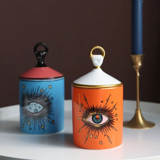 Big Eyes Aromatherapy Candle Holder with Ceramic Construction for Decorative Storage: Blue and Red Decal Designs Featuring Figures and Gods