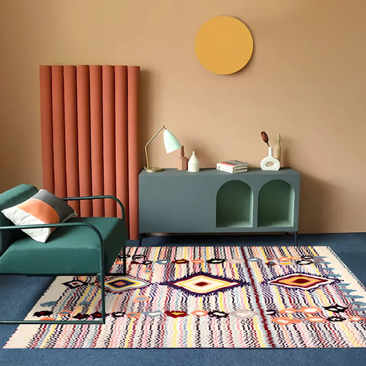 Boho-inspired polyester rug available in 60x90cm, 80x120cm, and 80x160cm sizes, machine-woven for consistent texture, hand-washable for easy maintenance, suitable for living rooms, bedrooms, and commercial spaces like hotels
