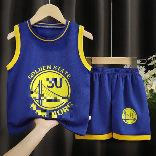 Boys' basketball sports suit with two-piece set design featuring chemical fibre blend fabric available in eight height sizes from 90cm to 160cm for active play