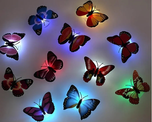 Butterfly LED night light set of 12 pieces with auto-changing colours and soft illumination for bedrooms and decorative spaces, featuring ABS plastic construction and 3.5cm suction pads for versatile placement