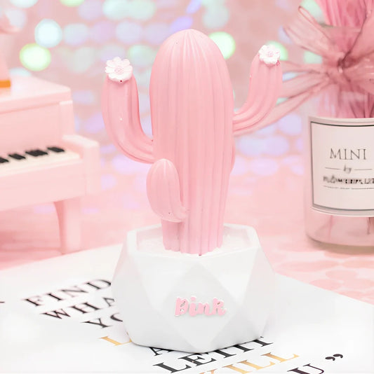 Cactus-shaped resin night light with warm LED illumination, measuring 15cm tall and 8cm wide, providing soft ambient lighting for bedrooms and hallways with energy-efficient operation