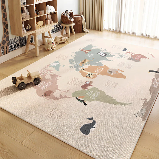 Cartoon animal print polyester carpet with geometric patterns available in seven sizes from 60x90cm to 200x300cm, featuring hand wash cleaning and vibrant printing techniques for household use