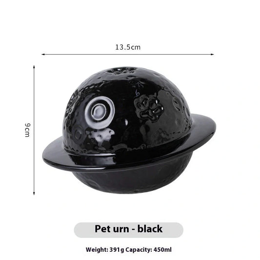 Ceramic cinerary casket for pet ashes, handmade with a cosmic starry sky design featuring cat and dog memorial motifs, available in eight colour options with golden edge detailing for personalisation.
