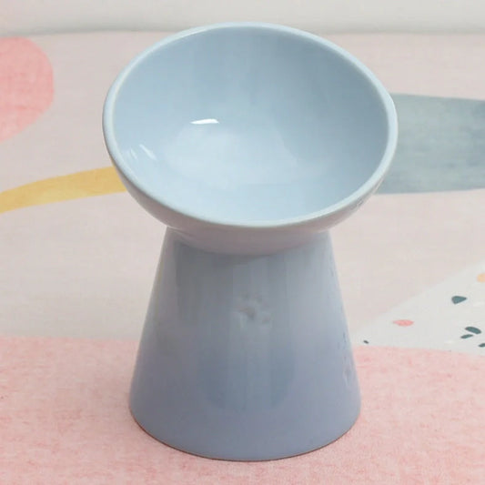 Ceramic pet bowl with high foot neck protector to prevent spills and reduce mess, featuring a 15cm diameter and 8cm height for cats and dogs of various sizes, available in multiple rim designs including flat and slanted options
