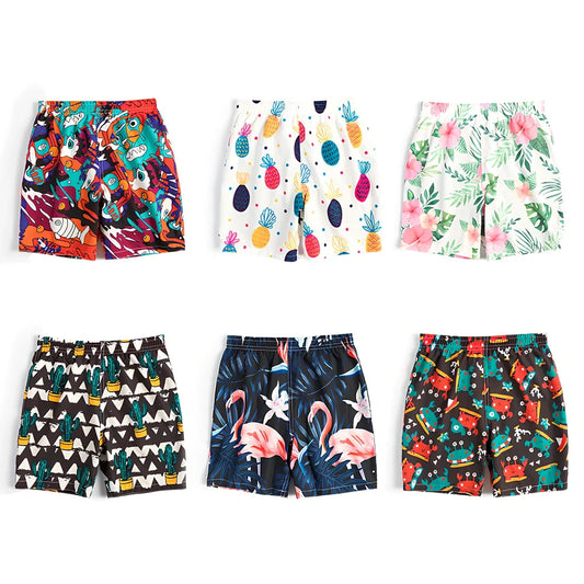 Children's beach shorts boxer swimming trunks with quick-dry polyester fabric, available in 13 colourful patterns from cactus to whale designs for ages 3-12 years