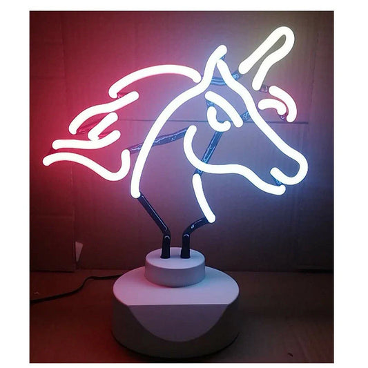 Creative Decoration Desktop Unicorn Neon Lights with 12V DC power supply and UL/CE certified adaptor for safe indoor display, featuring customisable neon tube colours and dual placement options on desk or wall