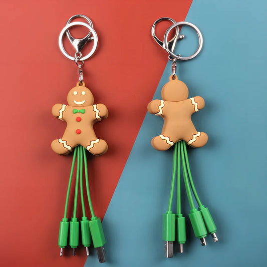 Creative Cartoon Multi Function Portable Christmas Data Cable: 55mm keychain cable with four-tap joint for charging multiple devices simultaneously while adding festive decoration
