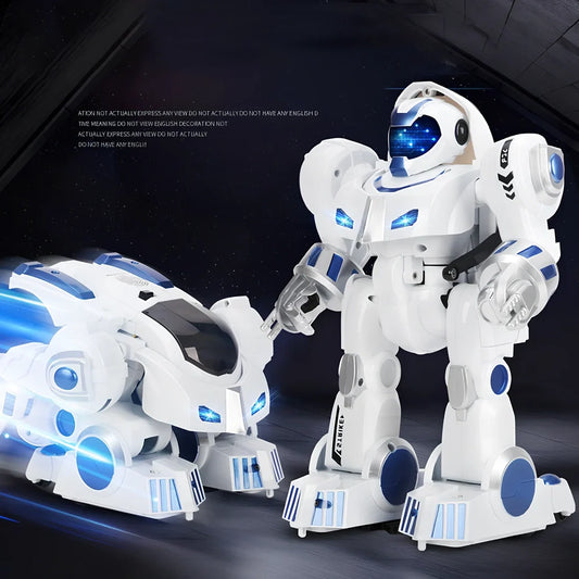 Deformed police robot toy with multifunctional remote control operation, designed for children's ability development including hand-eye coordination, sensory skills, and intellectual growth through interactive play