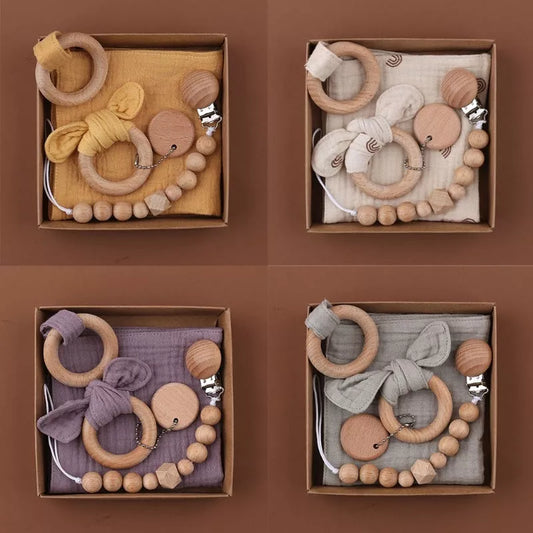hhomeenjoy.com Natural Cotton Baby Bath Toy Set with Wooden Rattle and Comfort Towel