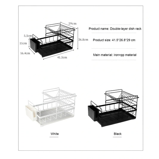 Double-tier metal wire kitchen dish storage rack with removable upper layer and bottom drain tray to prevent water accumulation on countertops