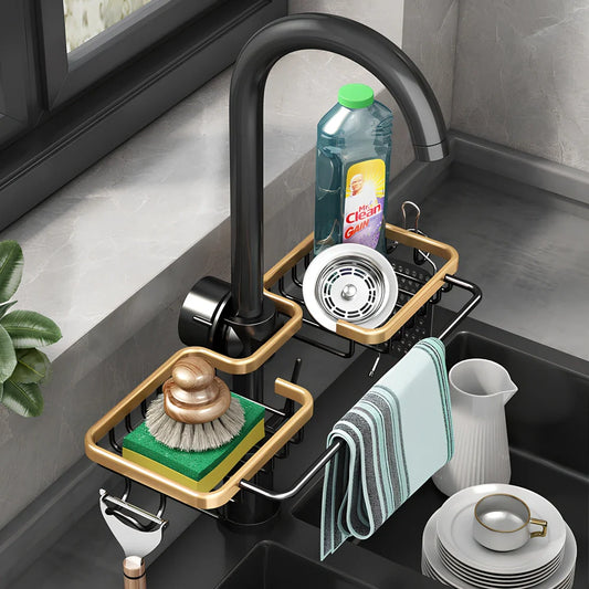 Kitchen storage faucet rack drain basket organiser with 2-tier aluminium construction and integrated towel rail for utensil drying and countertop organisation