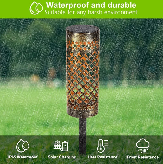 Metal solar-powered lawn lamps with geometric abstract art design, featuring IP65 waterproof rating for all-weather courtyard use and warm white illumination from integrated solar panels