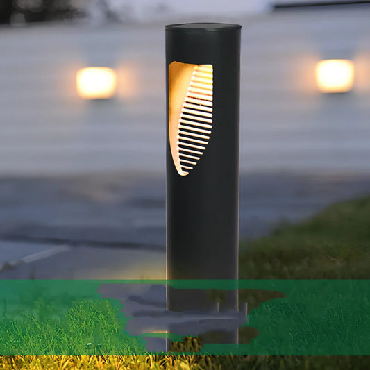 Solar cylindrical lawn light with 8-hour illumination from daytime solar charging, featuring 2.5cm solar panel and 23cm height for garden pathway lighting
