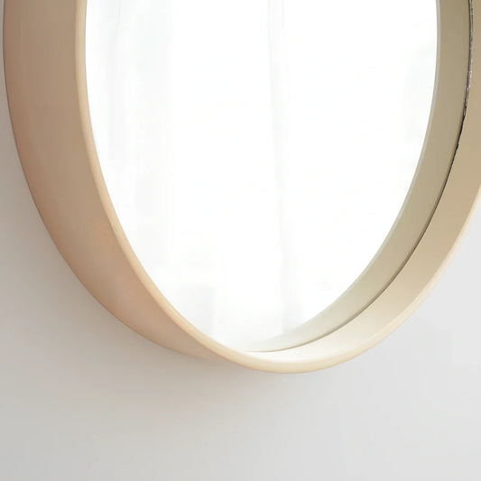 Solid wood bathroom mirror with float silver glass surface available in five sizes from 30cm to 60cm diameter for precise wall mounting and natural wood aesthetics