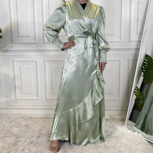 Women's patchwork Muslim dress featuring satin printing with polyester construction, available in five colours including apricot and gold, designed for 25-29 year olds with four-season versatility and Asian sizing considerations