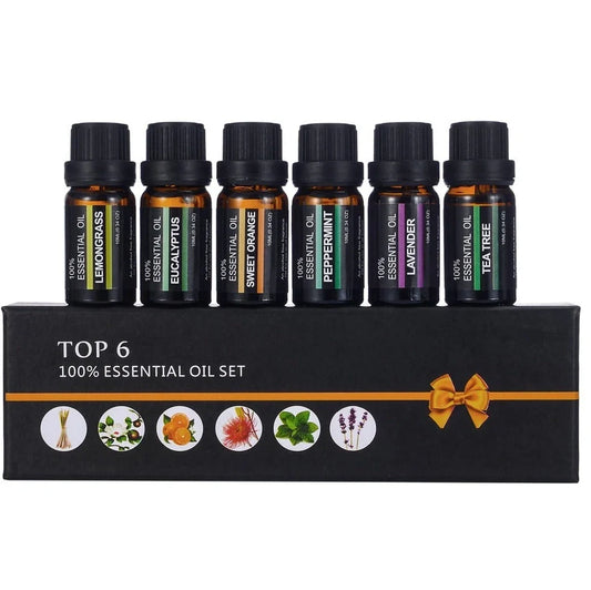Essential oil set containing six 100% natural aromatherapy oils including orange, lavender, tea tree, mint, eucalyptus and lemongrass for use in diffusers, humidifiers and oil burners