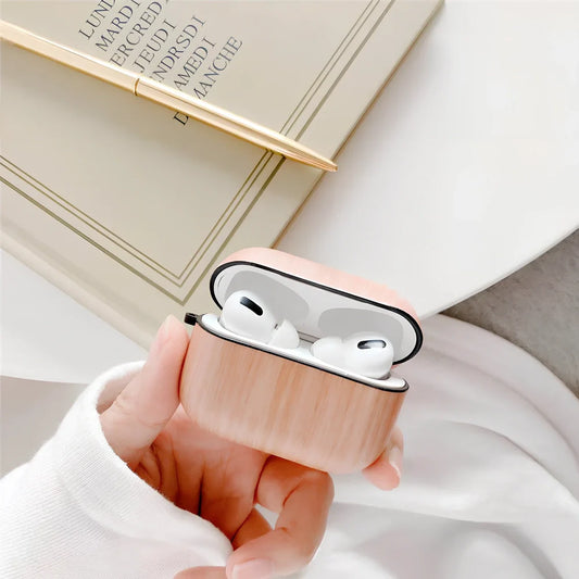 Wood grain AirPods Pro Bluetooth case featuring IMD clamshell design with six natural wood finish options including dark brown and red brown patterns for enhanced grip and scratch resistance