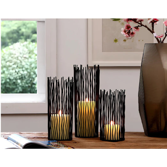 Wrought iron geometric candle holder with manual craftsmanship featuring three size options for versatile home decor arrangements and black finish for traditional British interiors