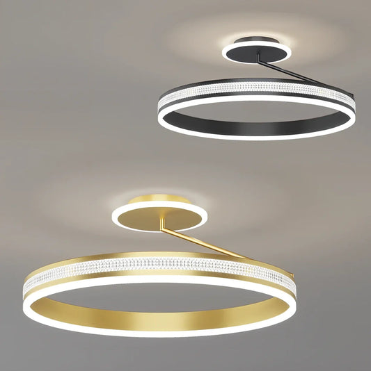 Modern and minimalist bedroom ceiling lights with infinite dimming control and LED illumination covering 10-30 square metres, available in black or gold with 40cm or 50cm diameter circular PMMA lampshade designs.
