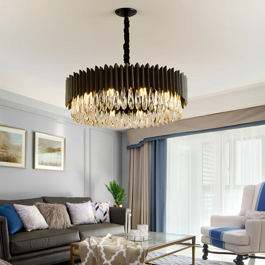 Modern black crystal living room chandelier with K9 crystal elements and iron construction, available in six size options from 55cm to 105cm diameter with tricolor lighting capability and universal 111V-240V voltage compatibility