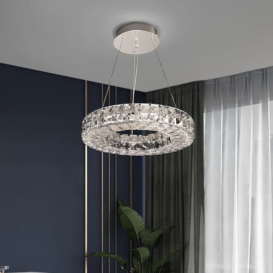 Modern crystal LED chandelier with adjustable 1-metre height and 20,000-hour lifespan, providing energy-efficient illumination for 15-30m² spaces with push-button control and multiple size options