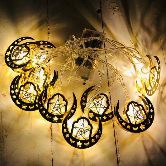 Muslim Ramadan Festival LED string lights with moon and stars pendants measuring 1.65m or 3m lengths, featuring battery-powered operation lasting up to 6000 hours for indoor Eid decorations