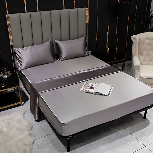 Fitted bed sheet with elastic band in artificial silk: available in 5 colours and 10 size options including flat sheets up to 245x270cm and fitted sheets with 36-40cm depth for secure mattress fit
