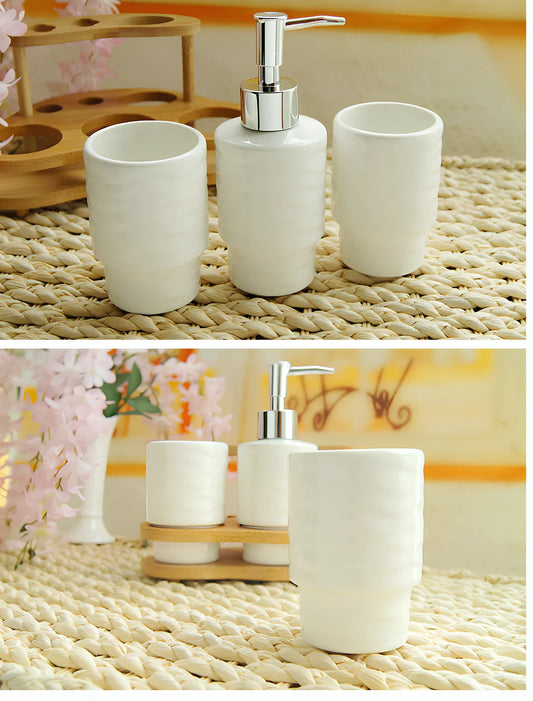 Five-piece bathroom accessories set with 200ml capacity ceramic cup and 22.5cm wide wooden storage frame for organised countertop space and coordinated decor