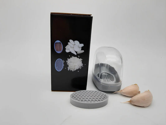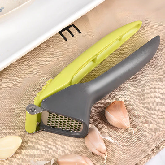 Plastic garlic masher with stainless steel crushing mechanism featuring ergonomic ABS handle design that efficiently processes 4-6 garlic cloves per press with minimal effort required