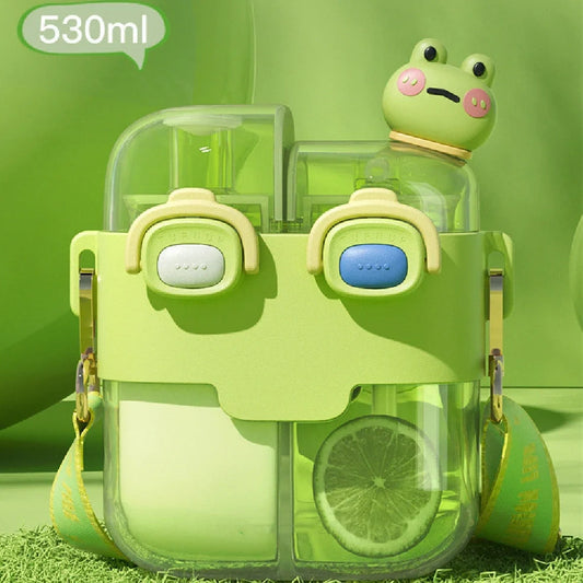 Plastic water bottle with one-button spring cover in vibrant colours including coral pink and lime green, available in 530ml and 780ml capacities with dimensions of 11.3x20.5x7cm for convenient carrying