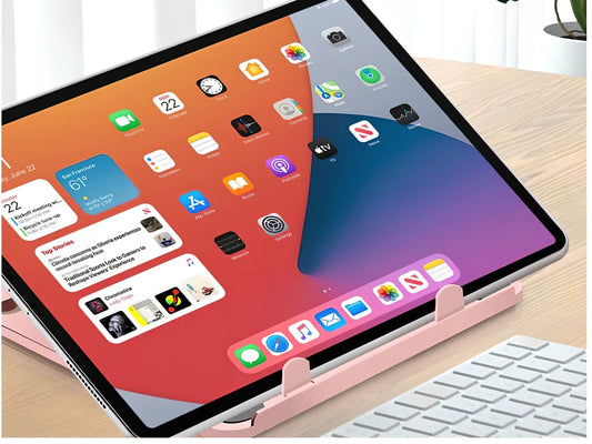 Portable laptop stand with eight adjustable height settings, expanding to 220mm x 200mm x 130mm for tablets and notebooks on desktops