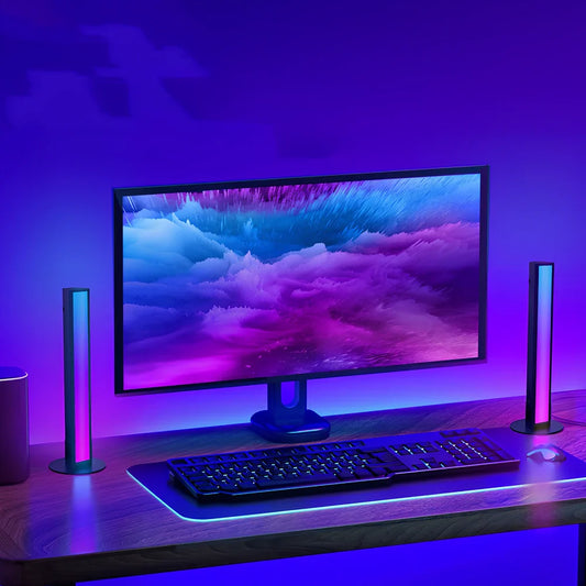 RGB ambient lighting system with 25.5cm light bars producing 470 lumens per unit, featuring dual connectivity options for Bluetooth and WiFi control with plug-and-play setup