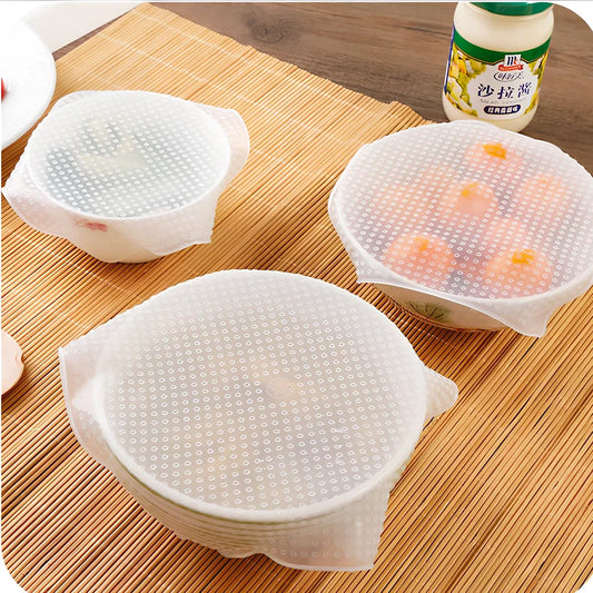 Reusable silicone stretch cling film with food-grade material that seals bowls up to 20cm diameter, withstands microwave temperatures, and provides airtight food preservation with repeated wash cycles