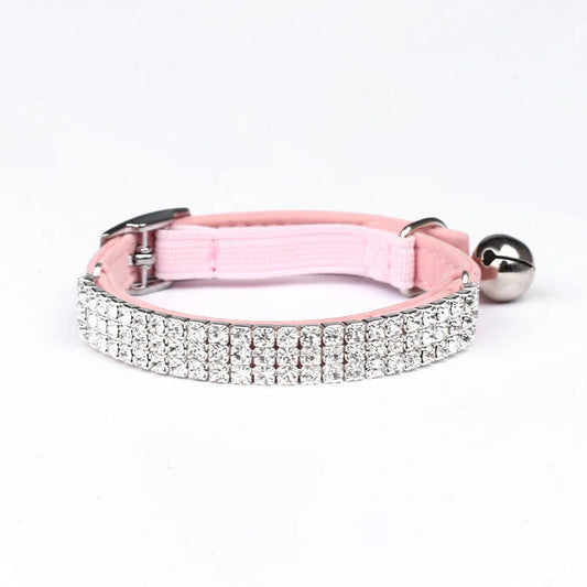 Rhinestone suede cat collar with 1cm width and adjustable 20-30cm length for secure fit, available in five colours including black, blue, pink, purple, and red velvet material